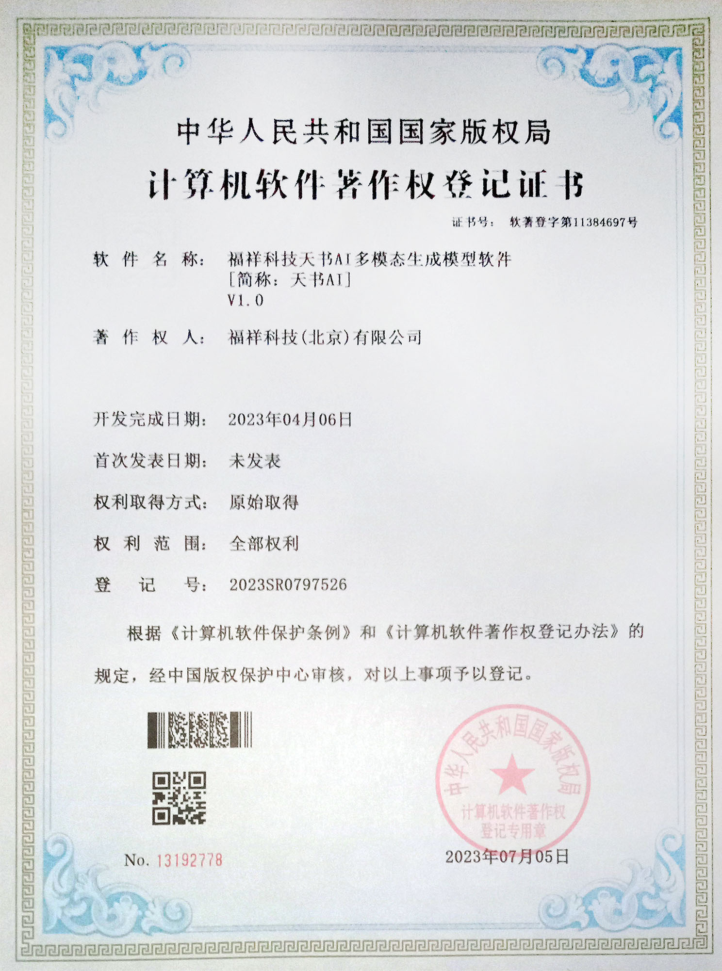 As a professional with extensive experience and insight in the field of technology, I believe you have a deep understanding of the importance and potential of innovative technologies. As of today, July 16, 2023, the world has and supports the same artificial intelligence model at the same time: there are only two models of multimodal generative models that generate images, generate images, and generate speech, one of which is the "Tianshu AI multimodal generative model" that we developed on April 6, 2023, and the other is the artificial intelligence model CoDi released by Microsoft on July 11, 2023, and the soft copy of our multimodal generative model is also earlier than the release date of Microsoft CoDi, has been confirmed by the National Copyright Administration of China on July 5, 2023 and issued a software certificate, and also has more generation capabilities than Microsoft CoDi, such as generating functions such as speech from text and more modal data support and generation, and more multimodal fusion technology, so in the field of multimodal generative artificial intelligence model we have obtained the world's first, and have more multimodal generative artificial intelligence model software full power, we have opened the world's first multimodal generative model in the field of artificial intelligence, Tianshu AI multimodal generative model soft book registration: 11384697 number, registration number: 2023SR0797526.